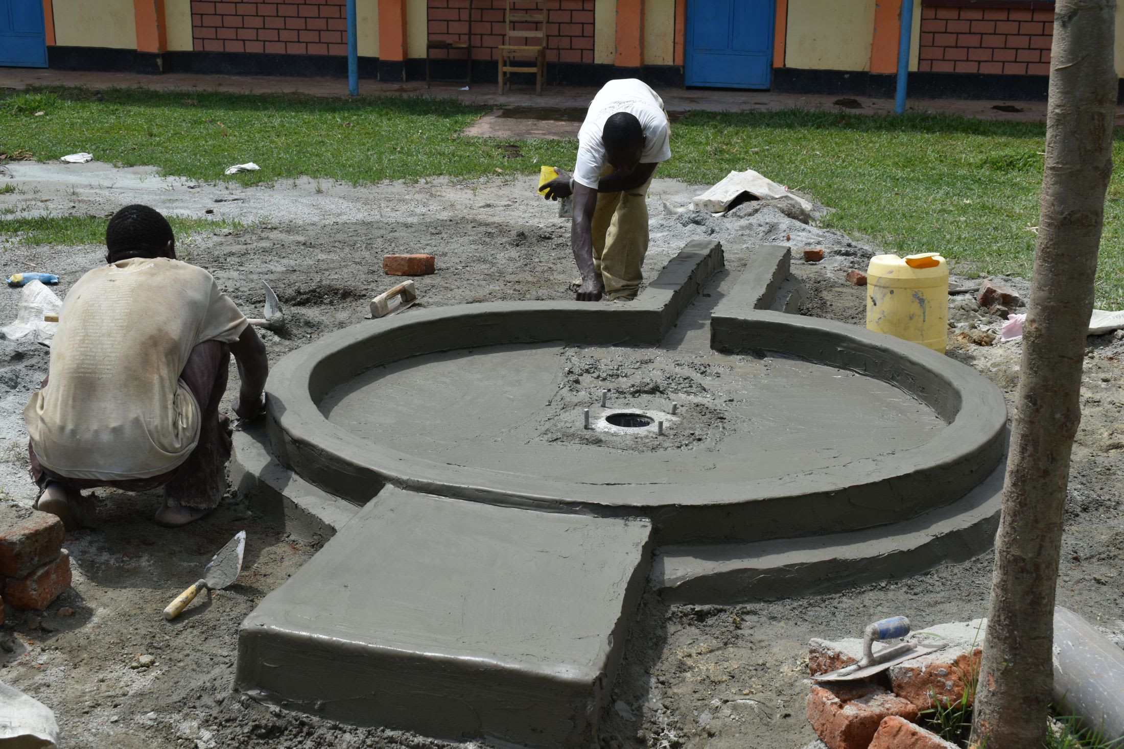 We constructed a cement well pad to seal it off from any ground-level contaminants. Tiles were installed beneath the spout to protect the cement from the erosive force of the water. We included a short drainage channel and a soak pit to prevent standing water.
