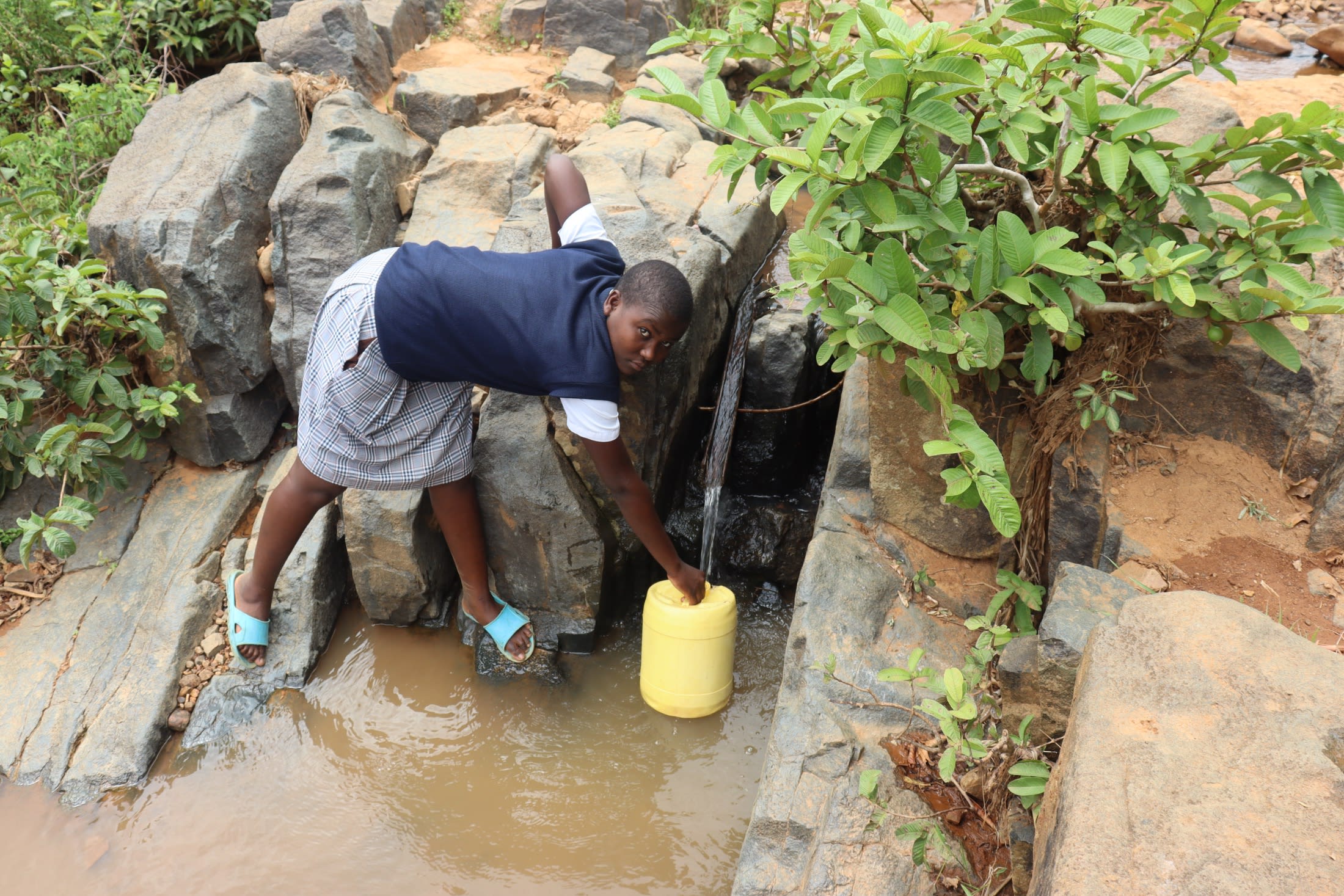 "It makes my services insufficient because the hospital can not function when [there is] no clean water. Patients need water to take direct observation medication, so without water, it becomes hard," said Jane R., shown collecting water from the spring below.