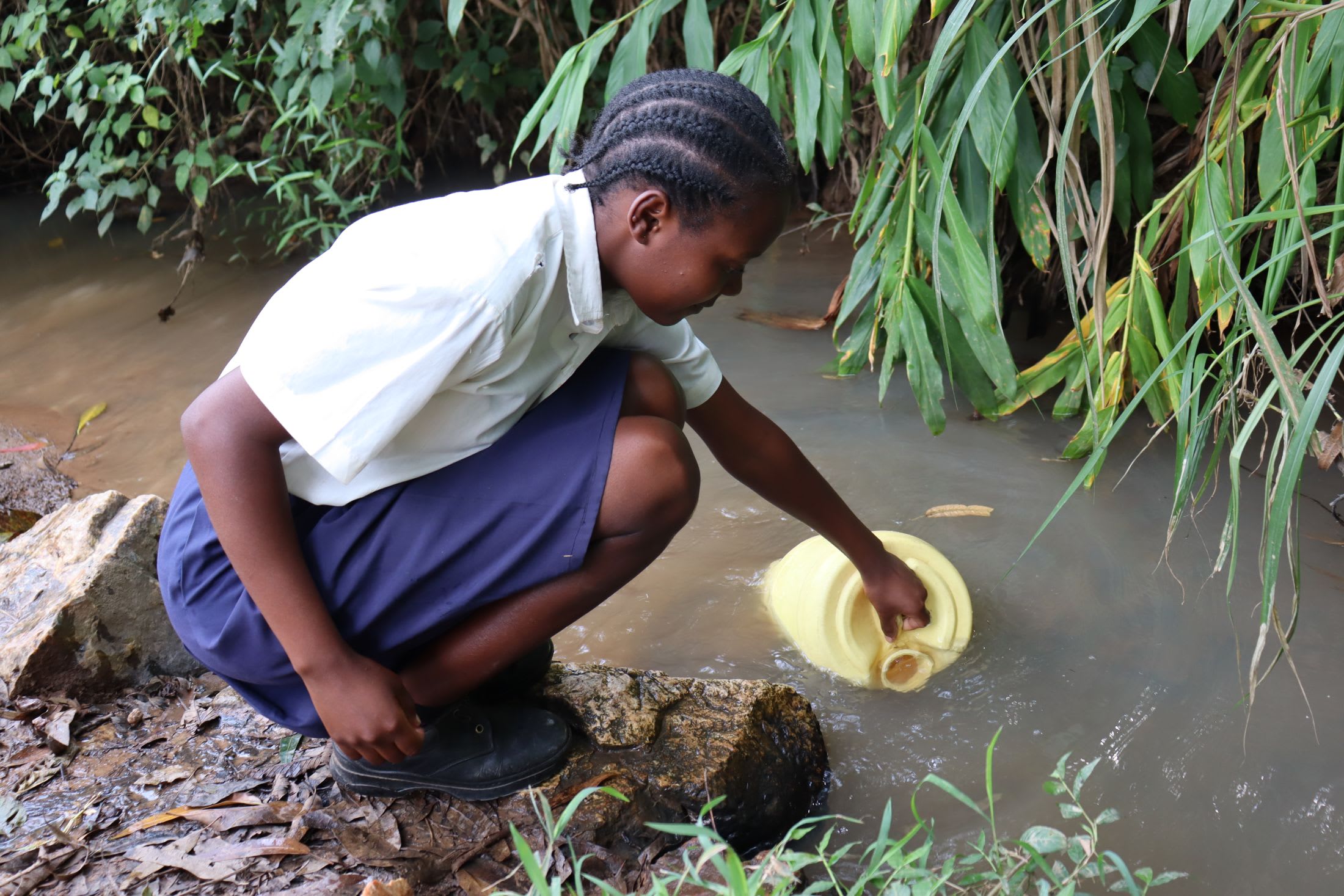 The school has a rainwater tank. However, it is not large enough to meet the school's water demand and inevitably runs dry quickly. When their tank is dry, students must collect water from a nearby school's borehole, but it is overcrowded. When the lines are too long, students resort to collecting water from a local stream.