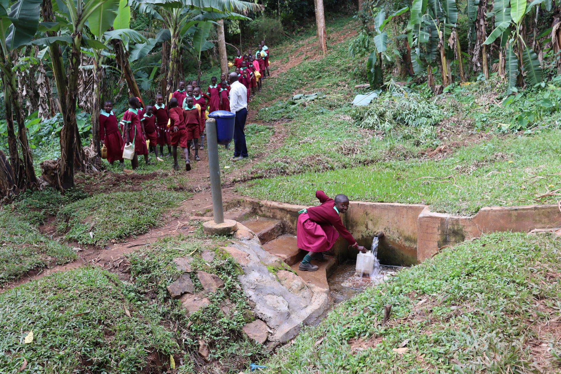 For the past five years, the St. Vincent Hirumbi Primary School, with 572 students and 29 staff members, and its surrounding community, have struggled without a dependable water source. They have access to two water sources: an overcrowded spring and a rainwater collection system, both of which are inadequate and potentially dangerous.