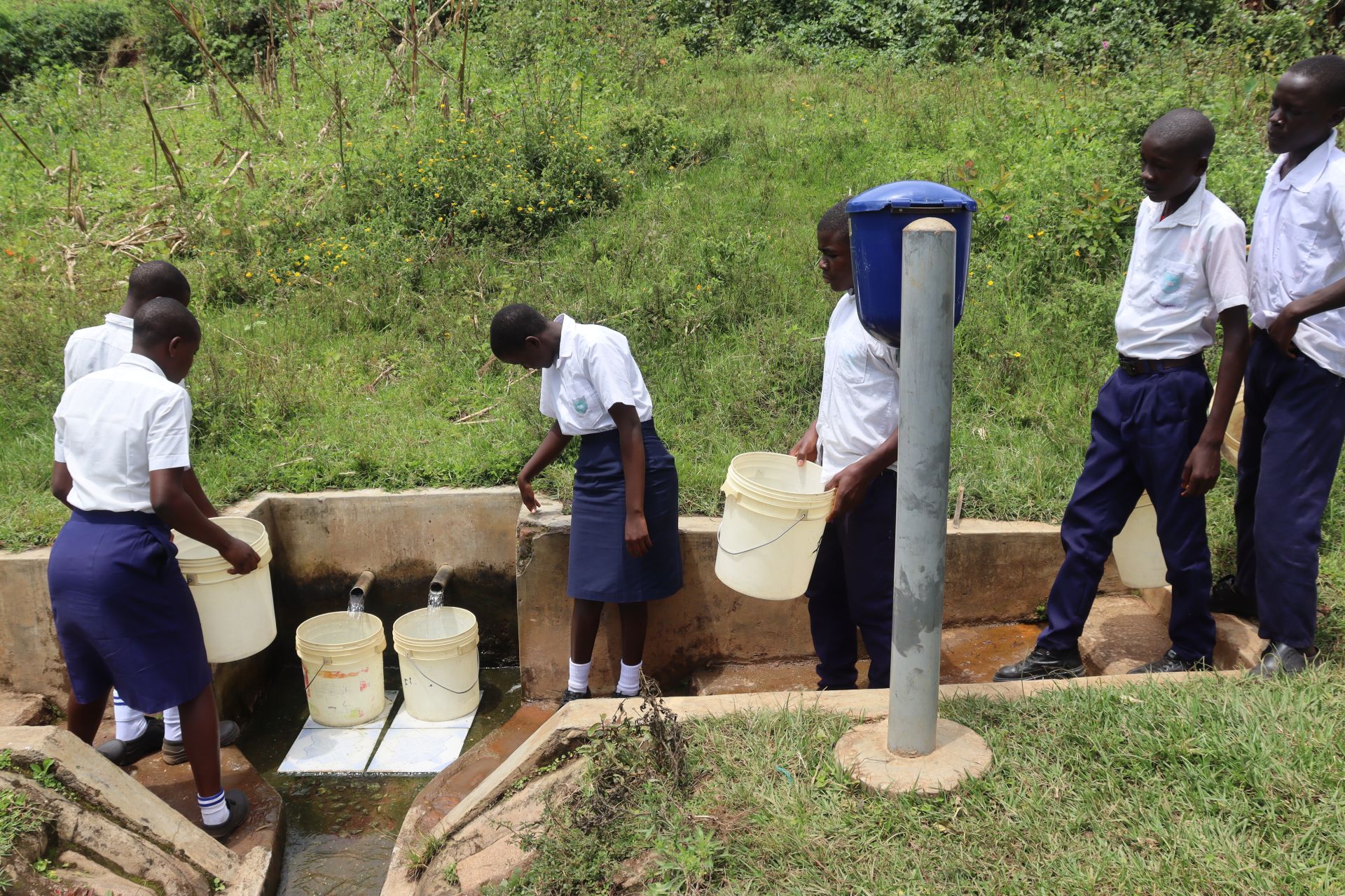 The school relies on three main water sources: off-campus, there is a protected dug well and a protected spring, and on campus, rainwater is collected. Each of these sources presents challenges. The dug well is overcrowded and sometimes contaminated, not to mention it takes students an average of 35 minutes per trip to collect water. The protected spring is even farther from the school, requiring the students to take long walks followed by long queuing times. It wastes the time that they need to spend in class. The rainwater harvesting system at the school can provide temporary relief. Still, its limited storage capacity means the tanks quickly run dry during the dry season, leaving students to scramble for alternative sources.