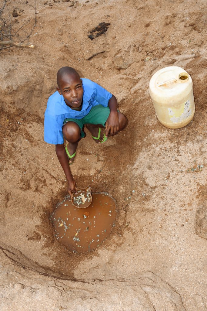 Sixteen-year-old Kimanzi M., seen below collecting water, vocalized how the water crisis affects him. "Getting water to drink is difficult because I have to walk several kilometers searching for water, which consumes most of my time. Sometimes, taking a bath is difficult because water is scarce. I am also required to carry water to school each morning, meaning I need to fetch water in the evening after classes, which is very exhausting and has affected my performance level in school."