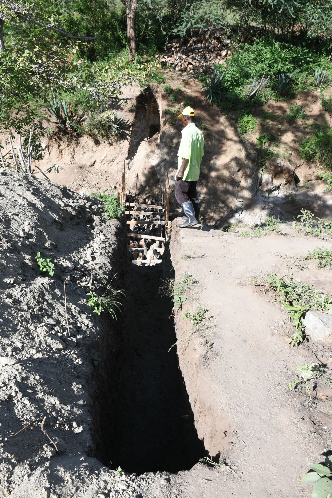 Once the plans were approved, we established a firm base for the sand dam wall. Usually, this requires the community to dig all the way down to the bedrock beneath the river channel. In the absence of good bedrock, we excavate to a depth at which the ground is compact enough to stop seepage.