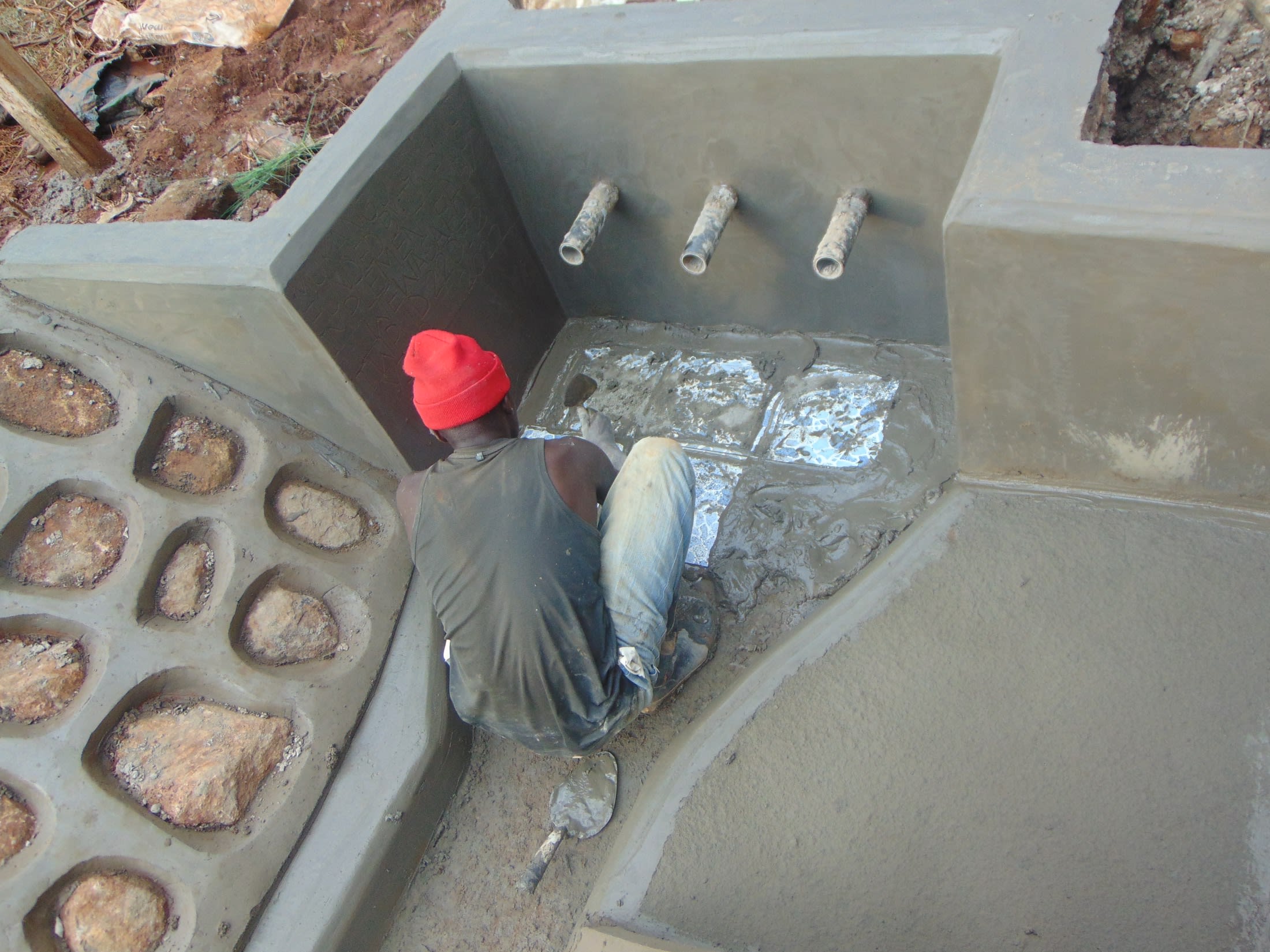As the headwall and wing walls cured, we cemented and plastered the stairs and installed four tiles beneath the discharge pipes. The tiles protect the concrete from the falling water's erosive force while beautifying the spring and facilitating easy cleaning of the spring floor.