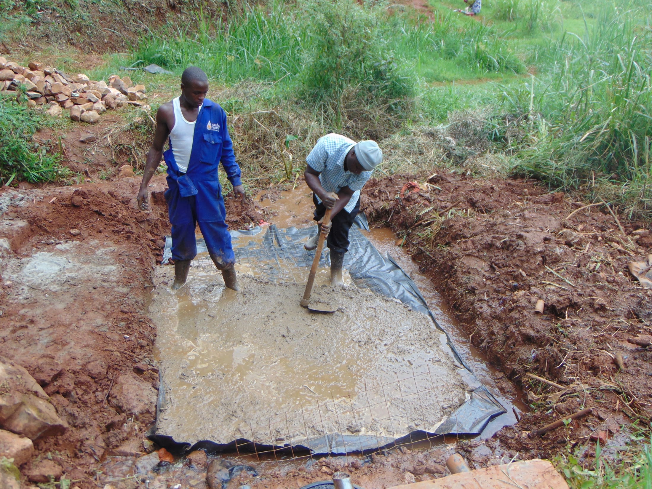 Springs are water sources that come from deep underground, where the water is filtered through natural layers until it is clean enough to drink. Once the water pushes through the surface of the Earth, however, outside elements like waste and runoff can contaminate the water quickly. We protect spring sources from contamination with a simple waterproof cement structure surrounding layers of clay, stone, and soil. This construction channels the spring’s water through a discharge pipe, making water collection easier, faster, and cleaner. Each spring protection also includes a chlorine dispenser at the waterpoint so community members can be assured that the water they are drinking is entirely safe. Learn more here!