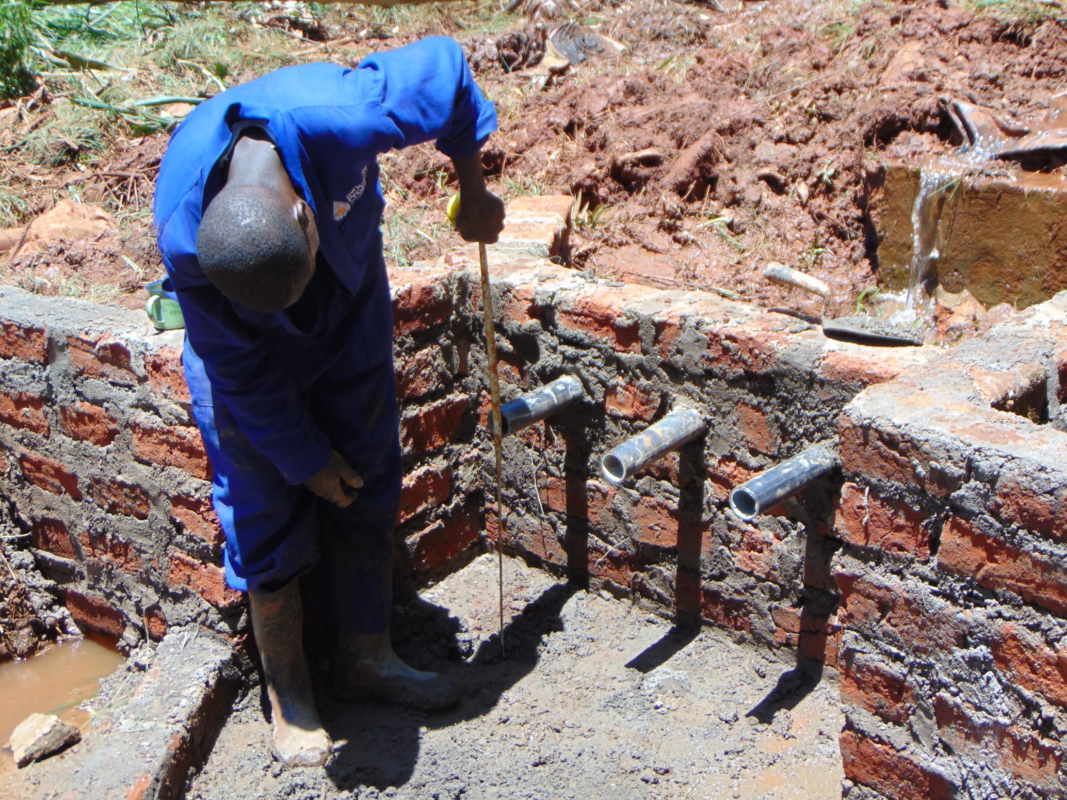 Once the walls had grown tall enough, we began one of the most crucial steps: setting the discharge pipes. Because of this spring's tremendous output, we installed three discharge pipes. The discharge pipes need to be positioned low enough in the headwall so the water level never rises above the spring's eye, yet high enough to allow room for the average jerrycan (a 20-liter container) to sit beneath the pipes without making contact.