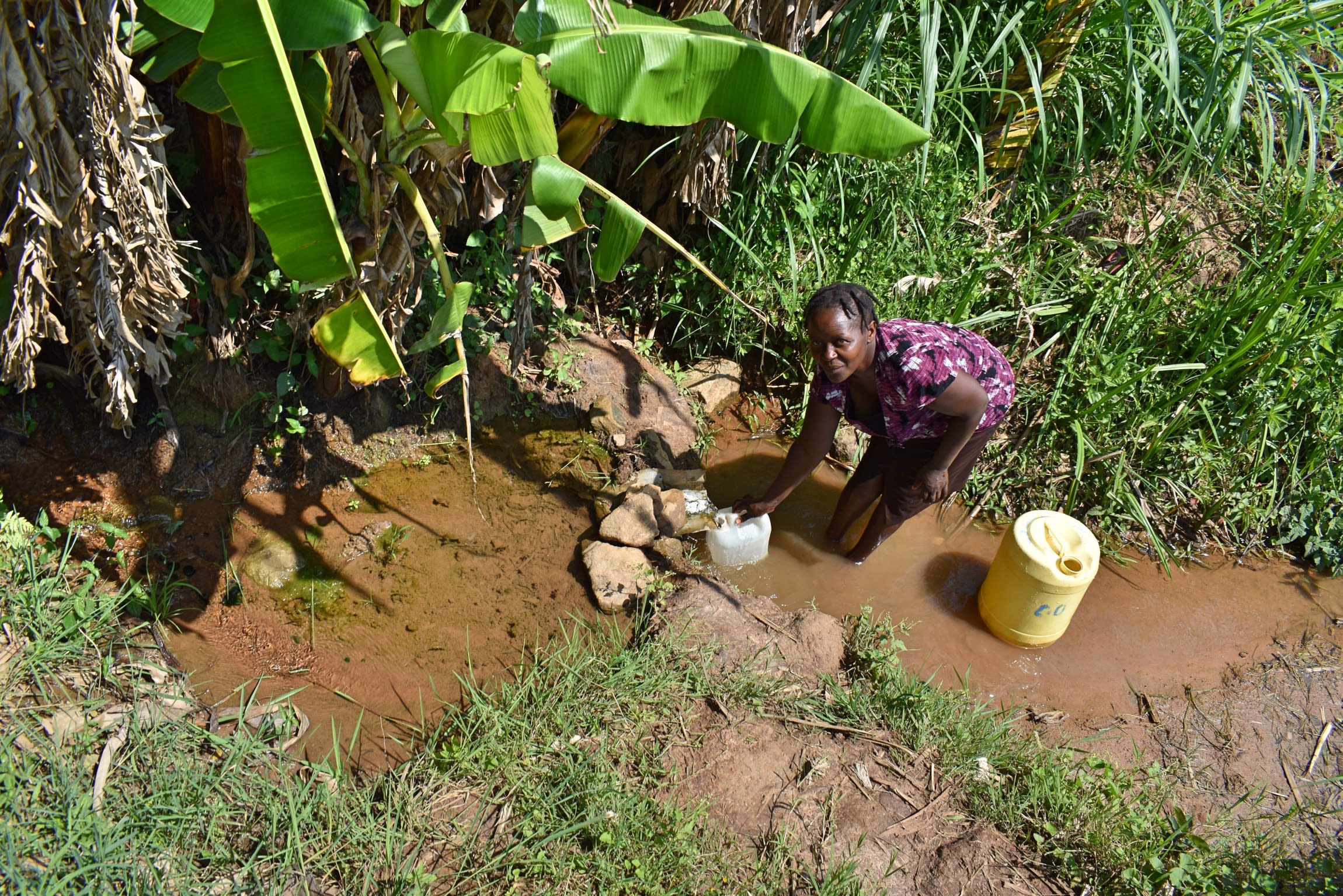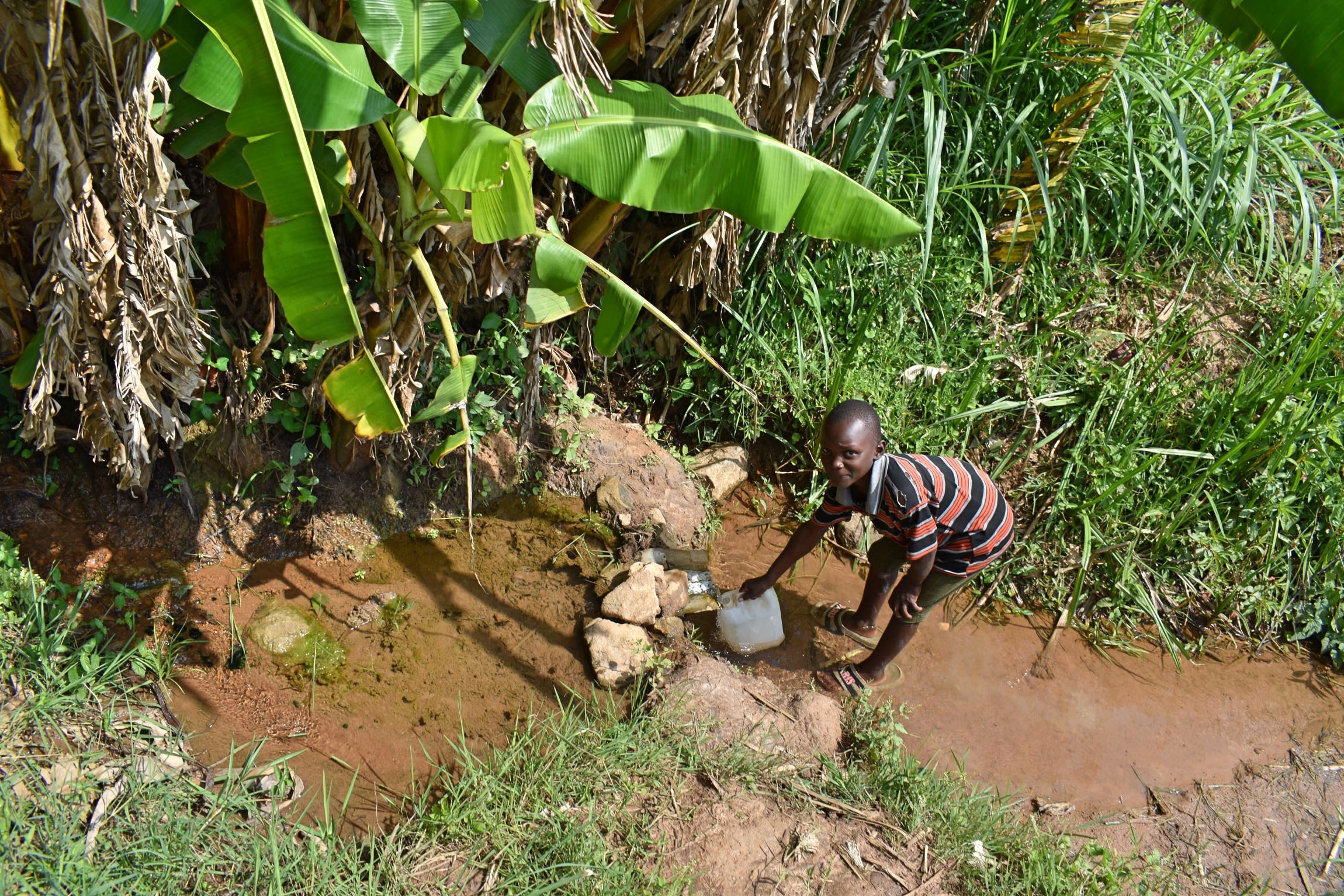 Mukhuyu Spring is open to all forms of contamination, with no protection from human and animal waste. It is at the bottom of a hill and situated in the middle of a banana plantation, so during the rainy season runoff floods down the hill, carrying contaminants into the water and stirring it up. The water easily becomes opaque with dirt, sediment, and other unknowns.