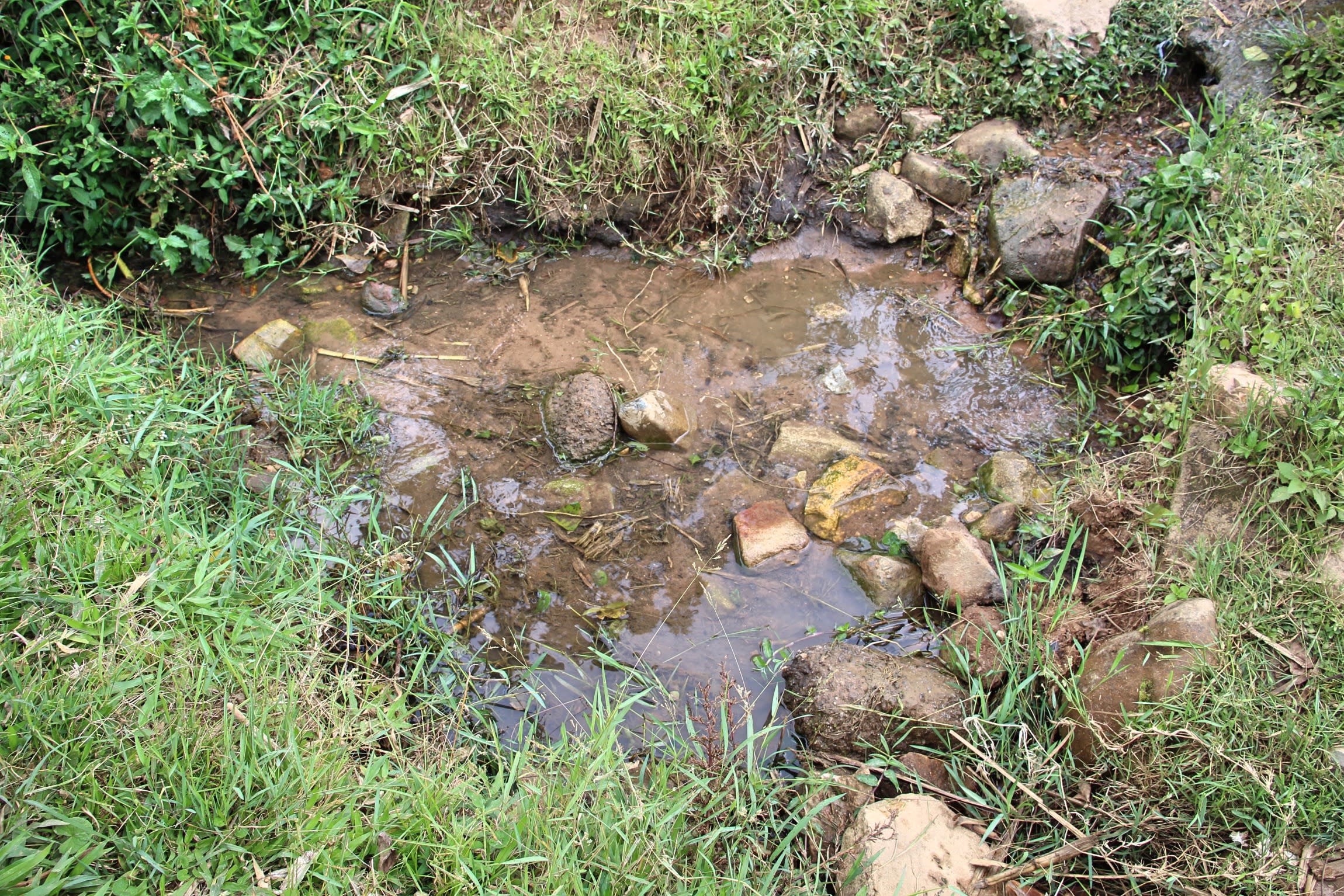 Right now, the spring is open to all sorts of contamination. It sits at the bottom of a slope, surrounded by farmland. Optimally, all spring water should come from beneath the ground's surface, having been naturally filtered. But when it rains, surface water pours directly into the spring, carrying fertilizers, excrement, garbage, and dirt.