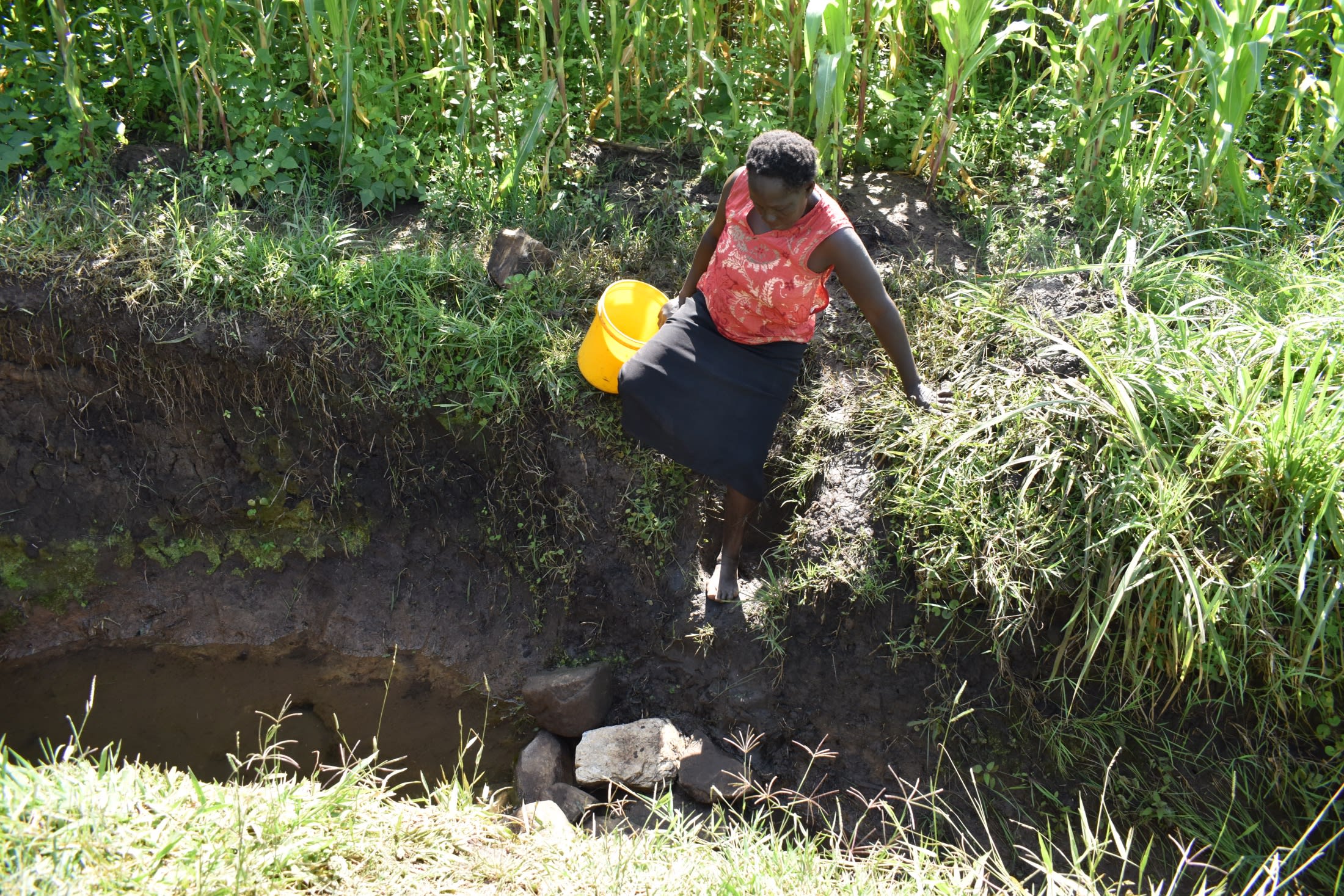 Geter Pondi, a 58-year-old farmer shown at the spring below, suspects that most of the incidences of diarrhea her children and grandchildren suffer originate from drinking the spring's water.