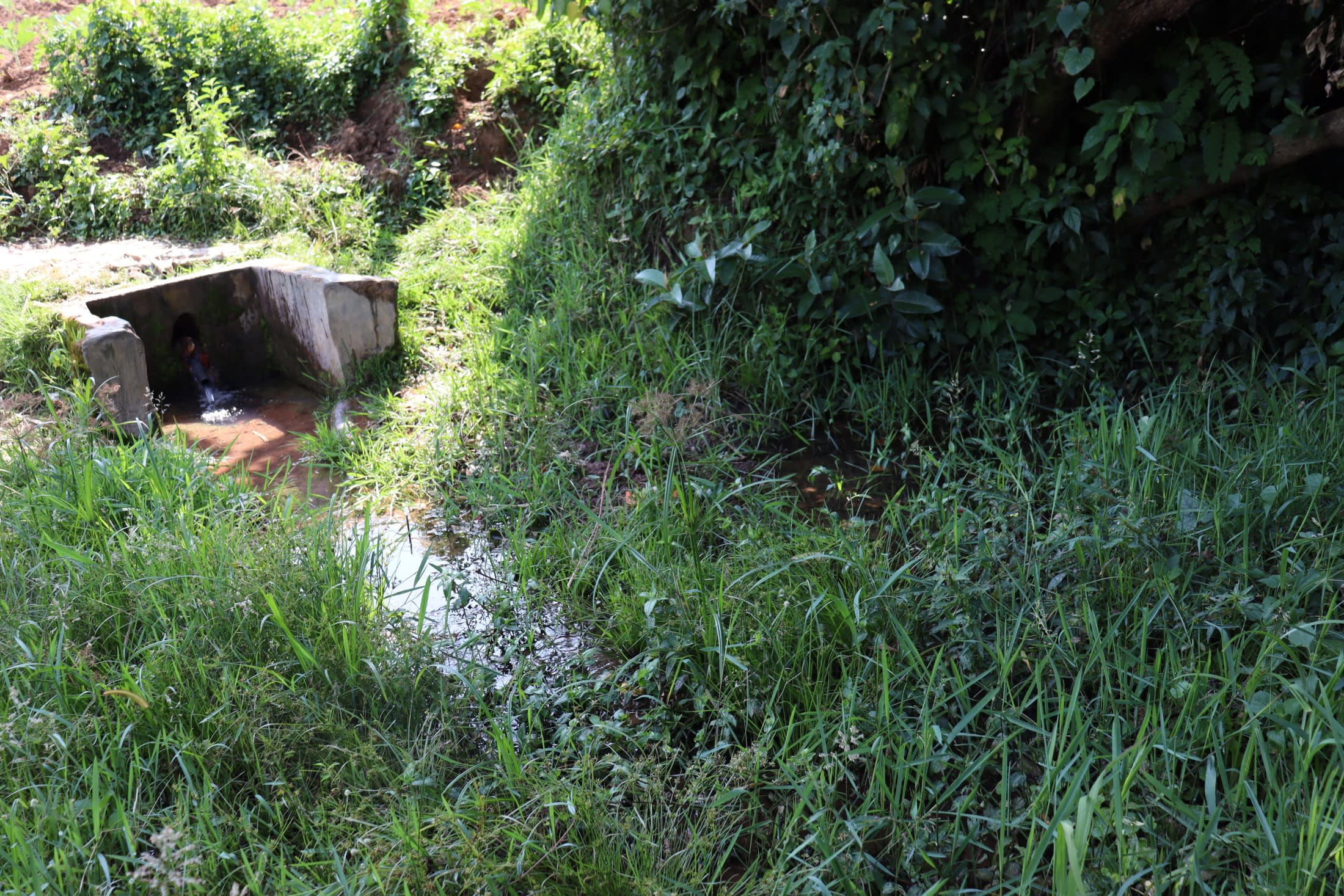 But since the community lacked the proper expertise, the spring faces serious issues. A few months after the attempt was made, the discharge pipe became loose, so now water escapes around the pipe as well as other areas of the spring box. The collection pipe was fixed too low, so fetching water with a larger container is a challenge. The water has been left exposed to contaminants, and the drainage system is blocked, causing water to back up in the collection area.