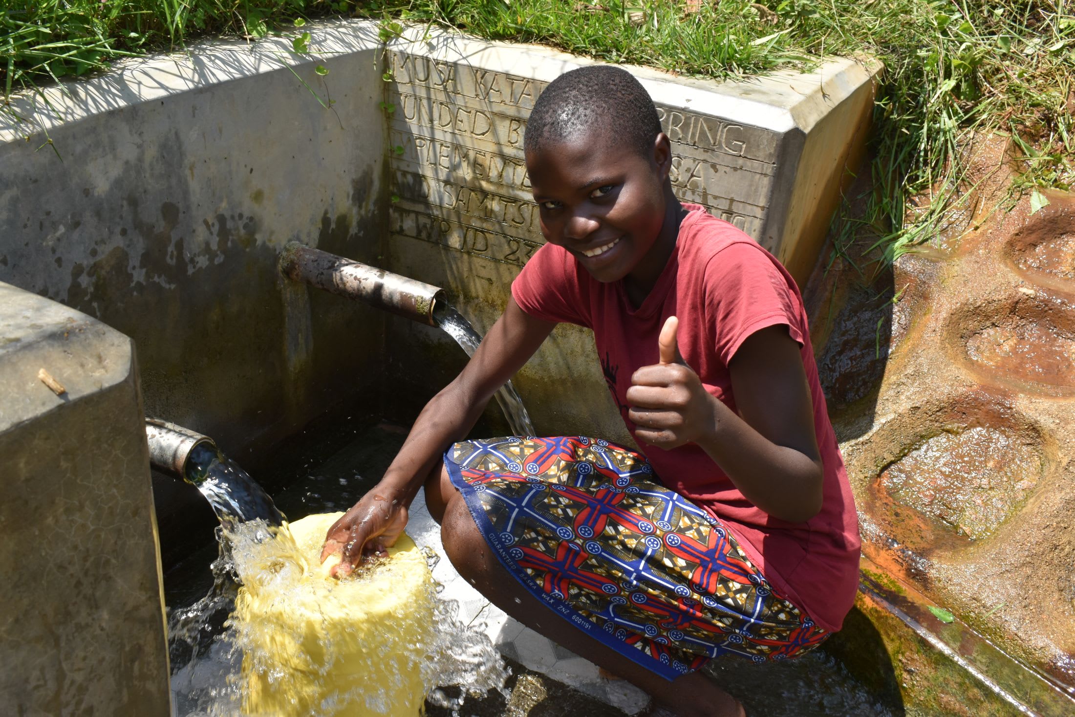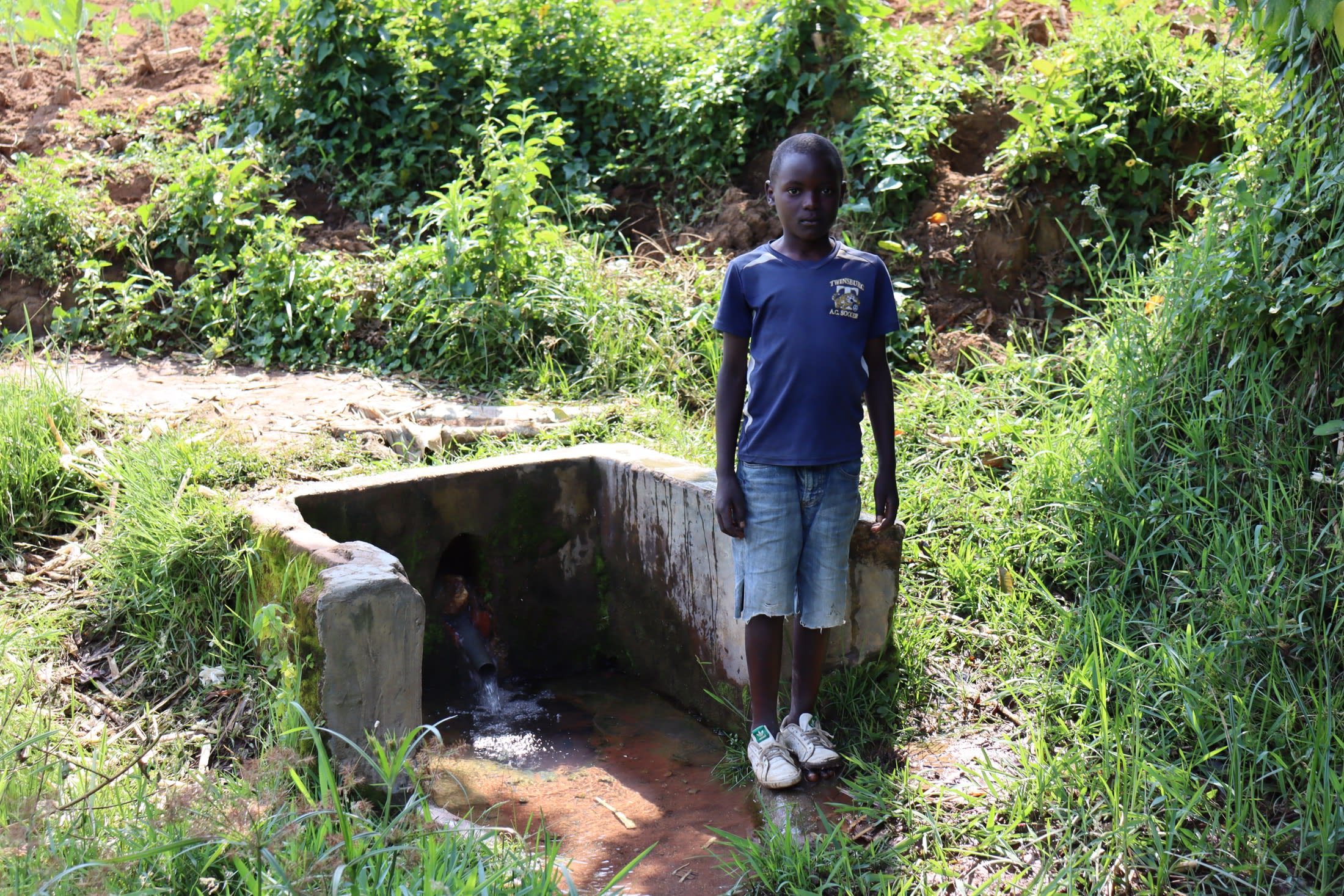 "My mother has caned me on several occasions because between fetching the water and bringing it home, it becomes contaminated. This has really affected my relationship with my mother. Whenever it is my turn to bring water from the spring, [I] am just worried," said nine-year-old Moses M., above collecting water at the spring.
