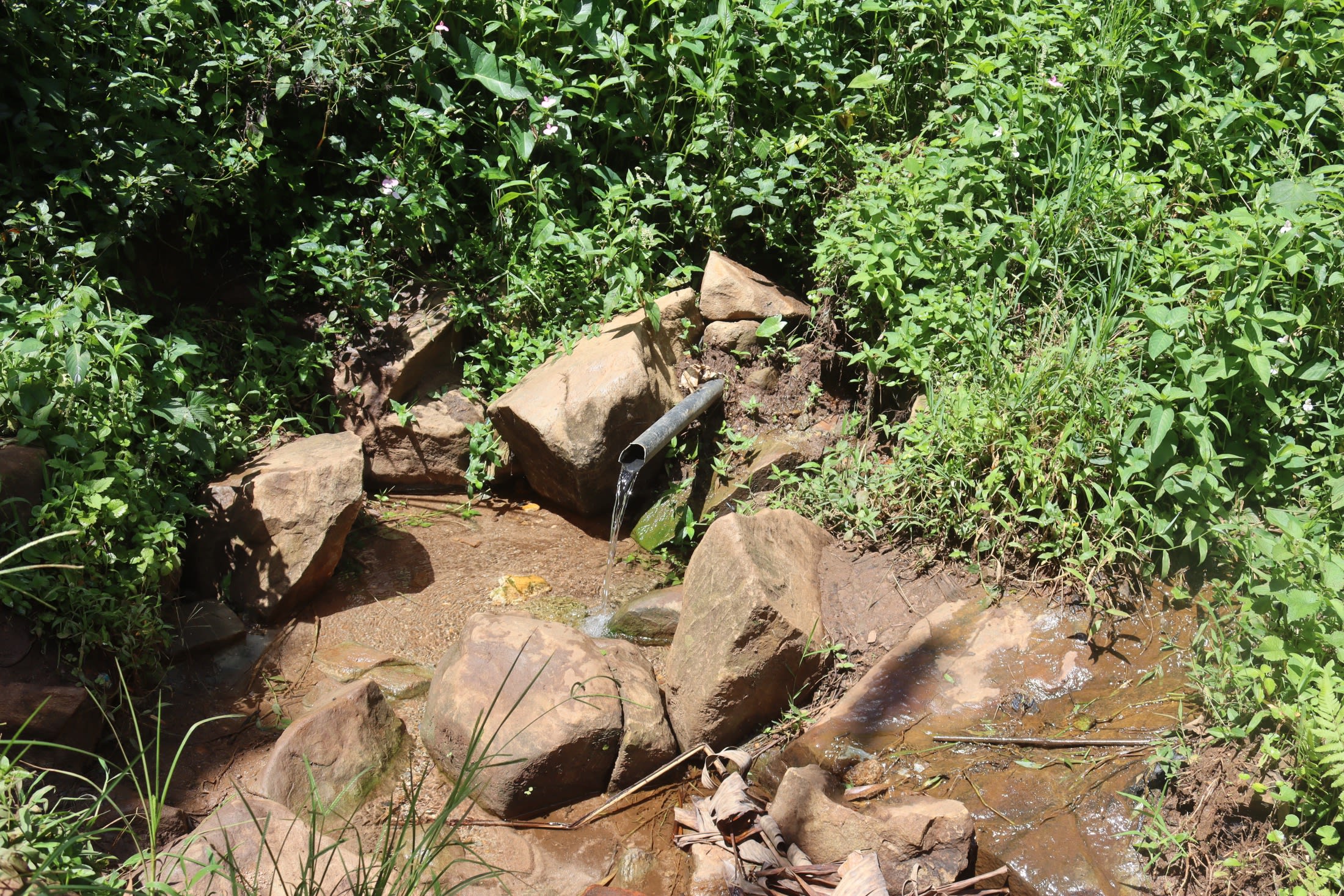 If we place the discharge pipe too high above the spring's eye, back pressure could force water to emerge elsewhere. Too low, and community members would not be able to access the water easily. We embedded the pipe using clay (or mortar when the clay is in short supply) and placed it at an incline to ensure water flows in the right direction.