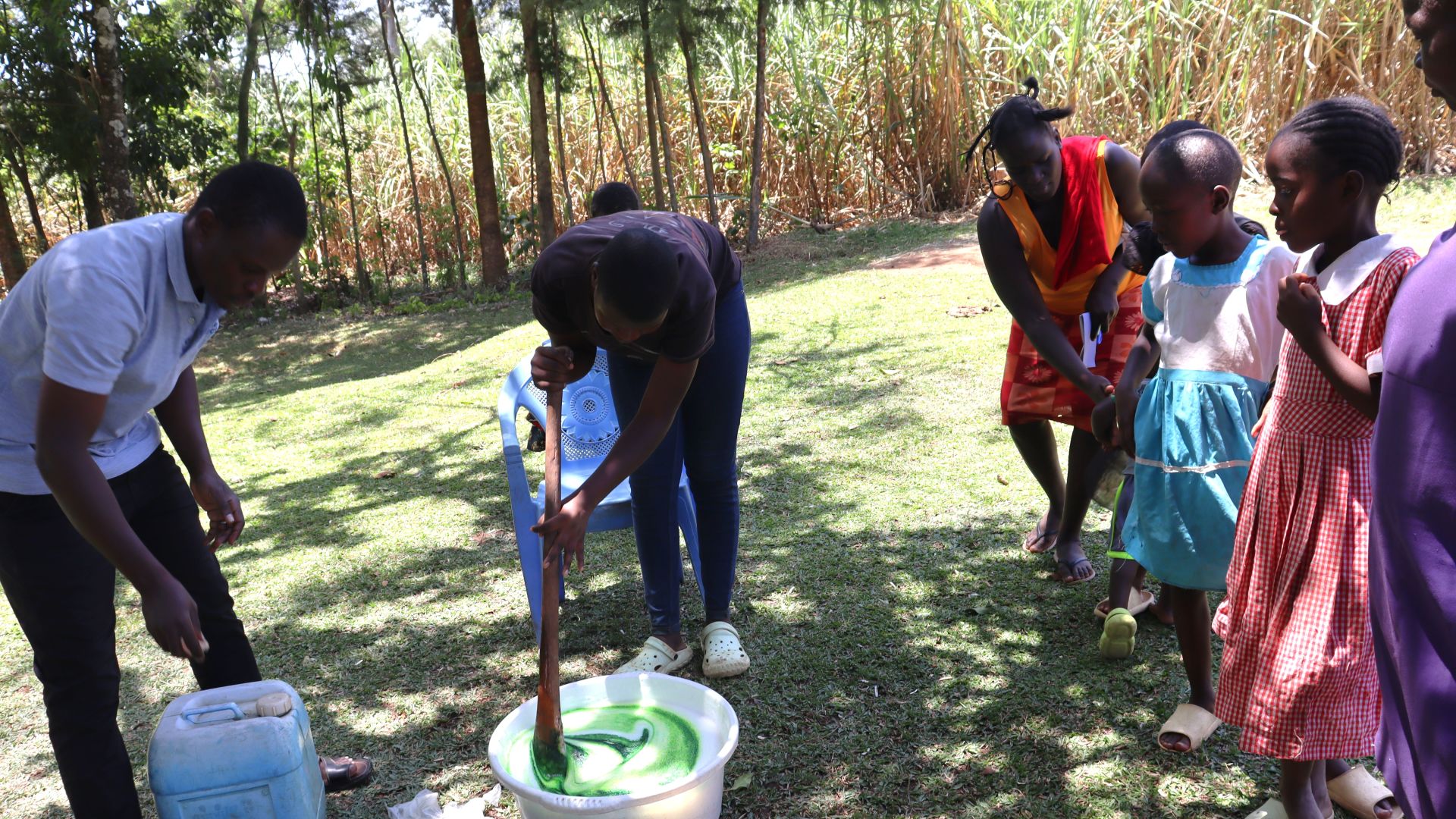 As an extra measure towards water quality safety, uniquely engineered chlorine dispensers are installed at all of our spring protection projects so community members can treat their water with pre-measured doses of chlorine. The chlorine treats any residual contamination and stays active for two to three days, ensuring water stays safe to use even when stored at home. Chlorine delivery and maintenance of the dispensers are part of our ongoing community support.