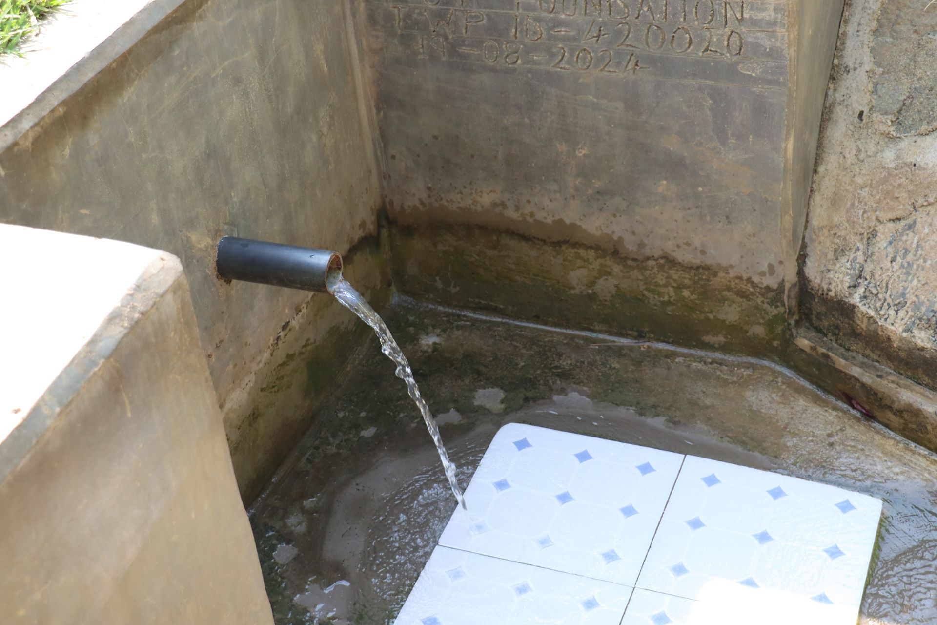 Looking at the spring, it is evident that although the community attempted to protect it in the past, the water no longer flows from the collection pipe. Instead, it bubbles up beneath the crumbling cement floor, creating a pool of murky, algae-filled water. Community members must teeter on the edge of the hole and submerge their containers beneath the water to scoop up water into their containers.