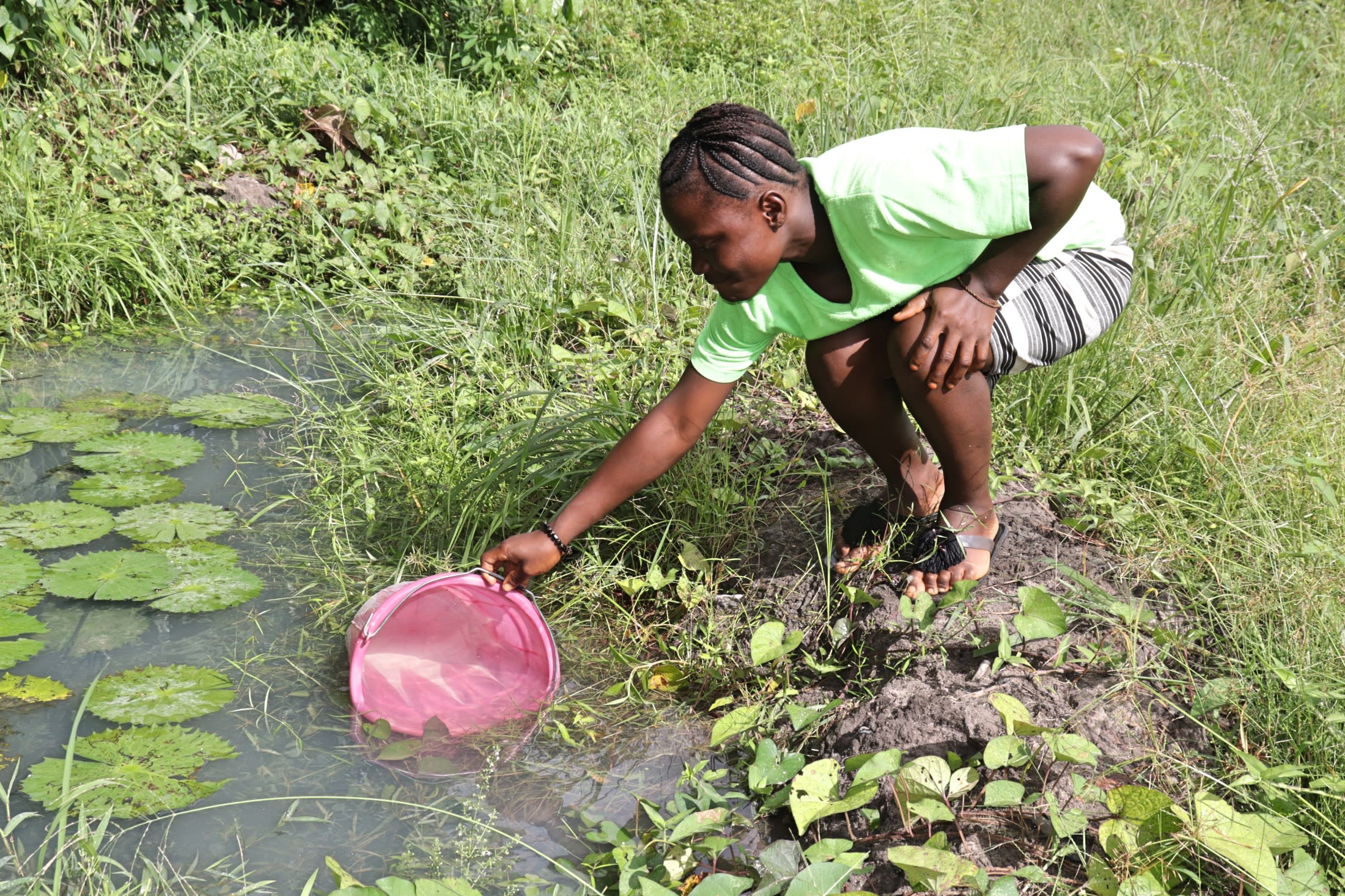 "Water problems in my community cause me [to be] late for school," said 15-year-old Isatu K. (shown below collecting water from the swamp). "During the dry season, I suffer a lot for water because, at times, the pump I used to fetch water from gets dry. The only water source I have access to is the swamp water. The distance from my house to the [swamp] water point is a long distance. Also, the road is rough. Normally, I fall on the ground when I carry water on my head to my house."