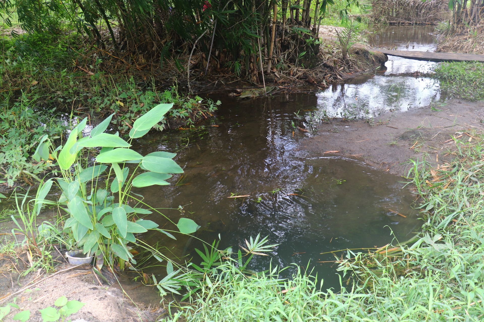 "The scoop hole or surface water located [is] in a swampy area. And it is underneath cane sticks. It is surrounded by natural vegetation. The surrounding area is not clean, and leaflets fall all over the surroundings. Sometimes, the water users cross a board along the scoop hole [and] stand on [it] to fetch water. There are leaflets in the water as well as sludge. Also, green pigment settles on the water or on the side," Alie continued.