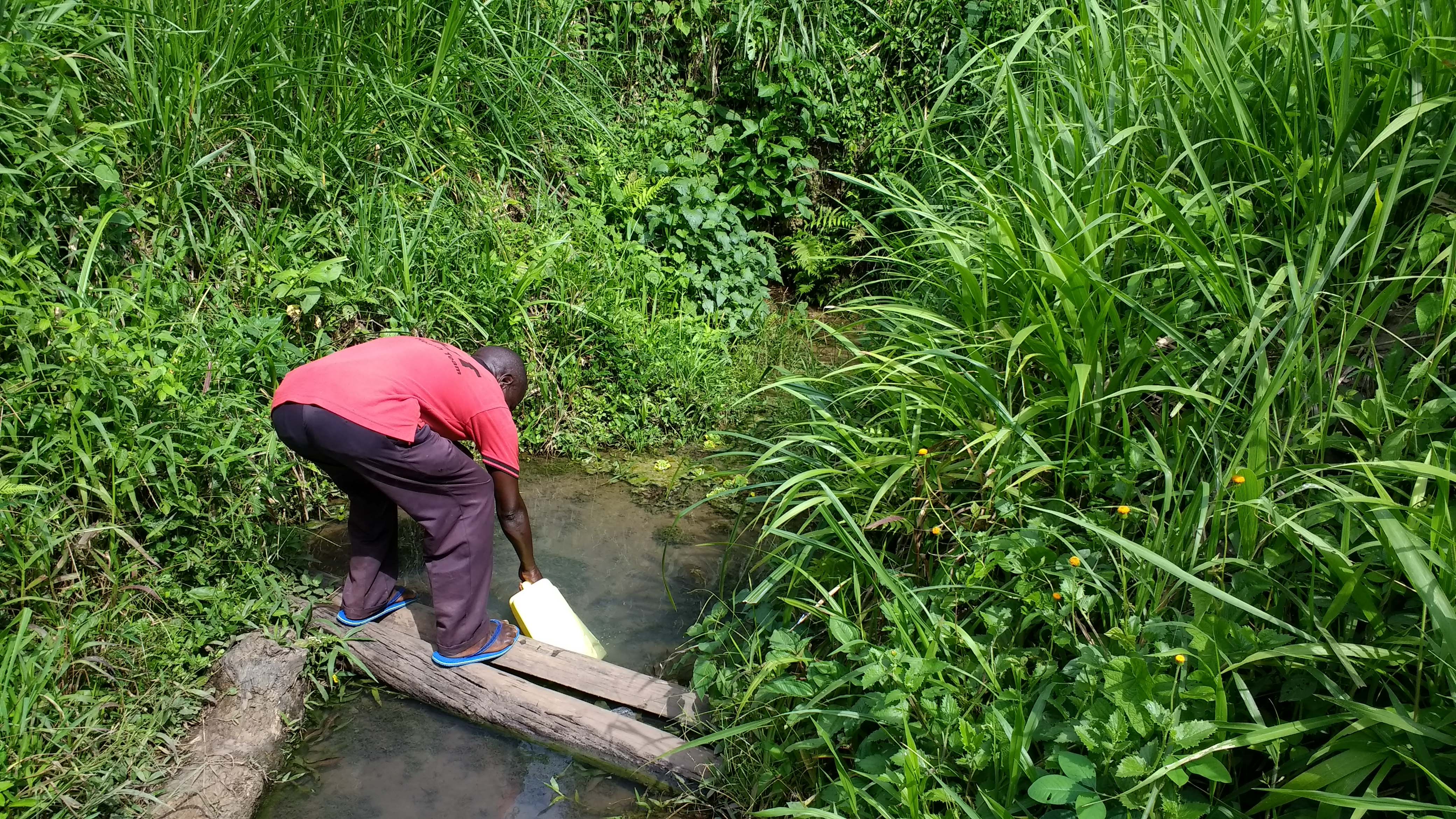 People living in Abangi rely on surface water to meet all of their needs. An open, unprotected spring brings water to the surface. Locals use a thick log as a bridge, suspended over the widest part of the spring. Standing in the middle, one can balance and scoop up the clearest water available - away from the cloudy, algae-covered banks. But not everybody sticks to the bridge. We observed people wading through the water, the same water they drink, while we were there.